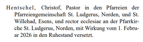 Unser Bischof hat Pastor Christof Hentschel auf eigenen Wunsch hin zum 01. Februar 2026 in den Ruhestand versetzt. Diese Nachricht ist im Amtsblatt 2025-14 mit Datum vom 27.11.25 veröffentlicht.